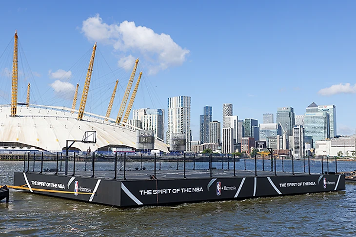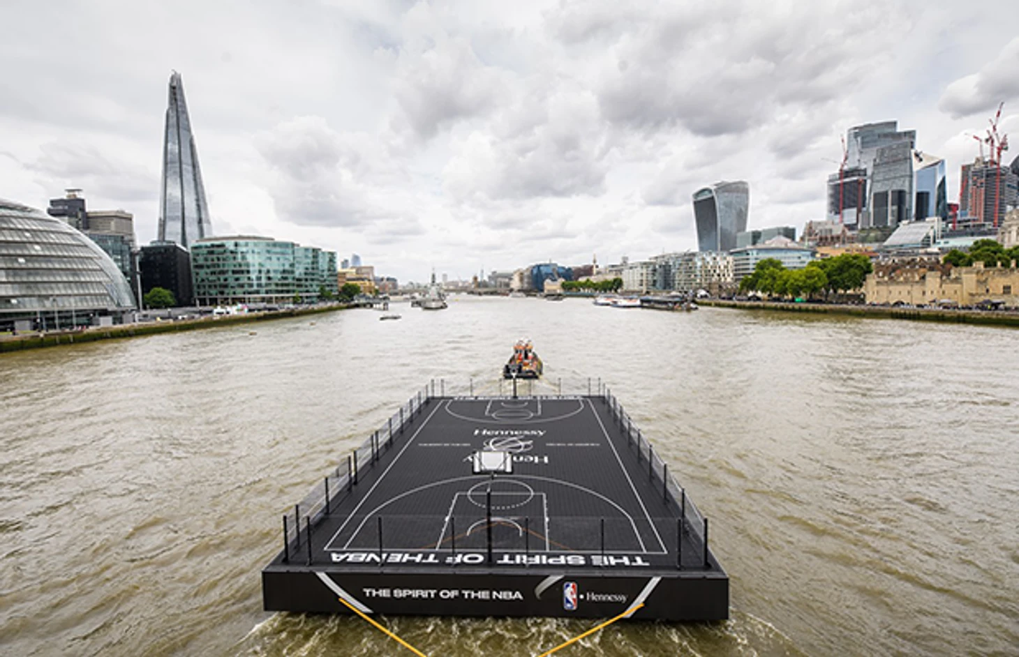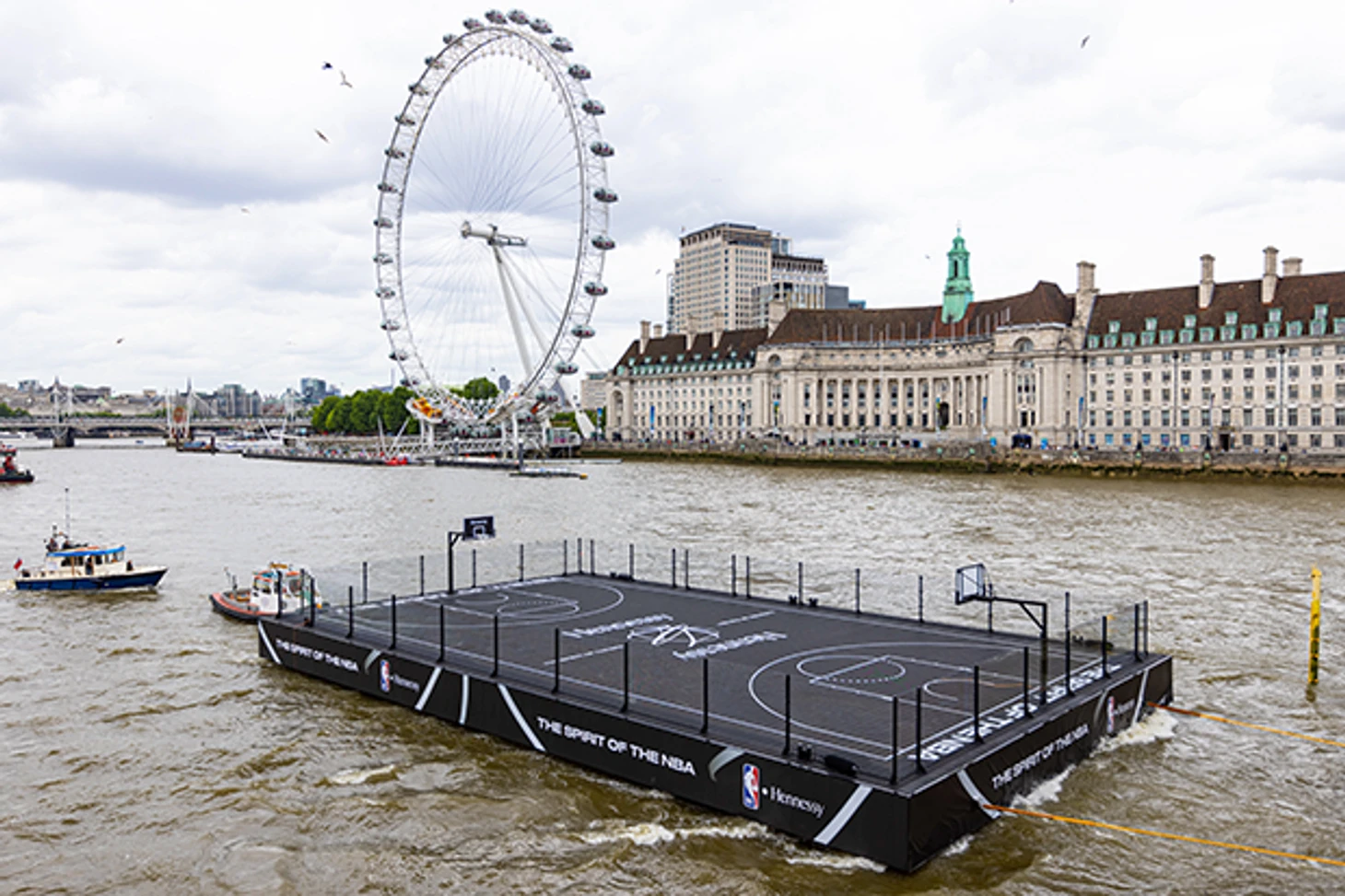 Hennessy и НБА представили первую в Великобритании плавучую баскетбольную площадку, которая была открыта на Темзе в Лондоне в честь 75-летия лиги и финальной серии плей-офф 2022 года.
