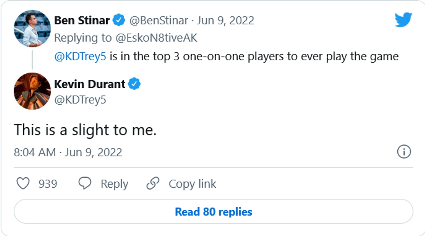 Репортер Бен Стинар заявил, что форвард «Бруклина» Кевин Дюрэнт входит в тройку лучших в игре один на один за всю историю НБА, и спросил у своих подписчиков, что они думают по этому поводу.