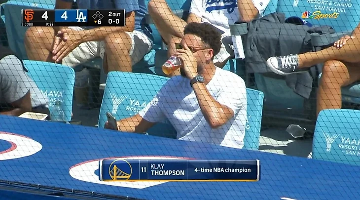Защитник «Голден Стэйт» Клэй Томпсон посетил матч бейсбольных «Доджерс» и «Джайантс» в Лос-Анджелесе.