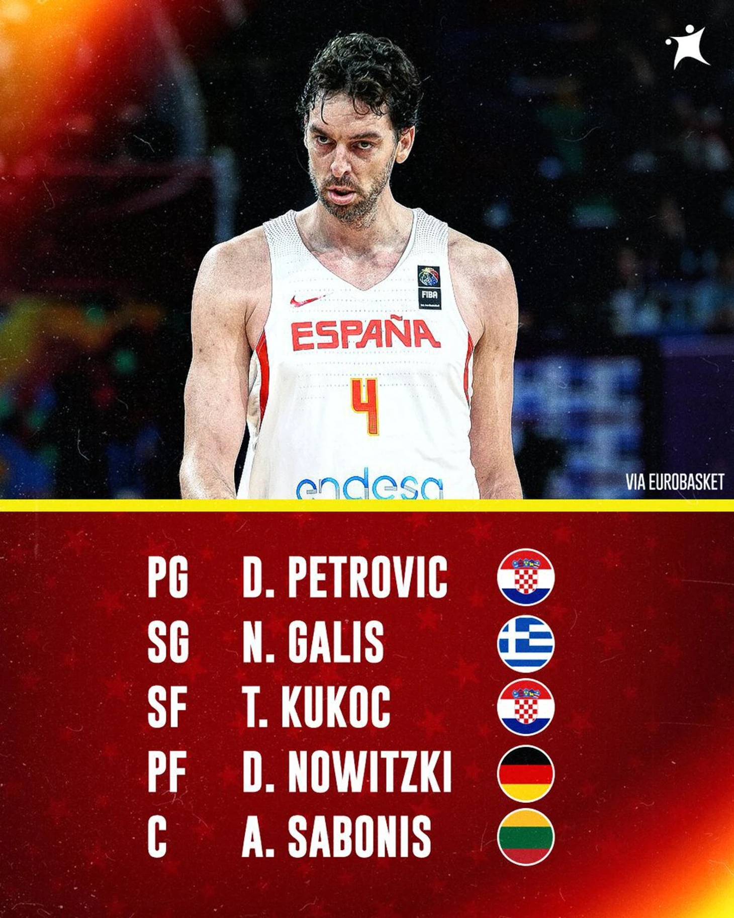 Знаменитый испанский «большой» Пау Газоль представил собственную версию символической пятерки чемпионата Европы всех времен.