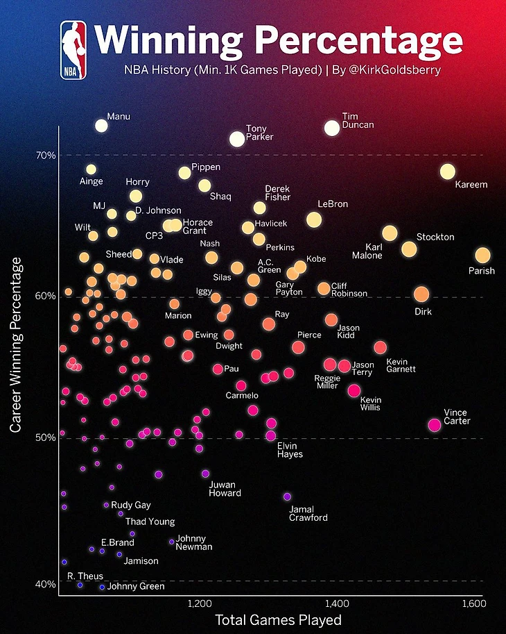 Из 141 игрока с более чем 1 тысячей матчей в НБА лишь Джинобили, Паркер и Данкан имеют более 70% побед