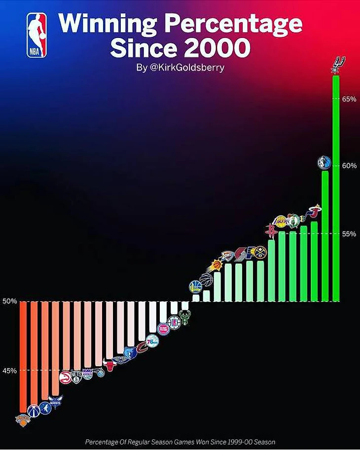 Аналитик ESPN Кирк Голдсберри опубликовал инфографику, которая показывает процент побед каждой команды НБА в матчах регулярного чемпионата с сезона-1999/2000.