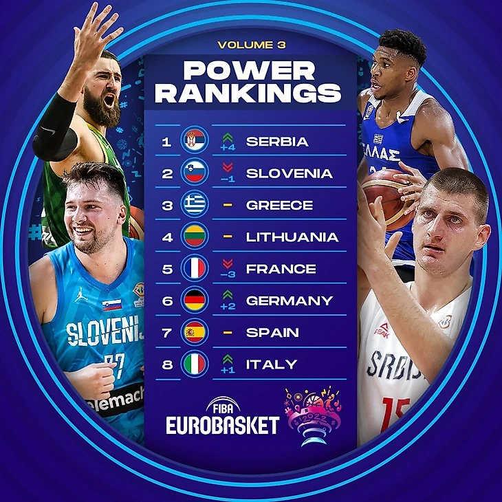 На втором месте рейтинга расположился действующий чемпион Евробаскета, сборная Словения Луки Дончича («Даллас»), а на третьем – сборная Греции Янниса Адетокумбо («Милуоки»).
