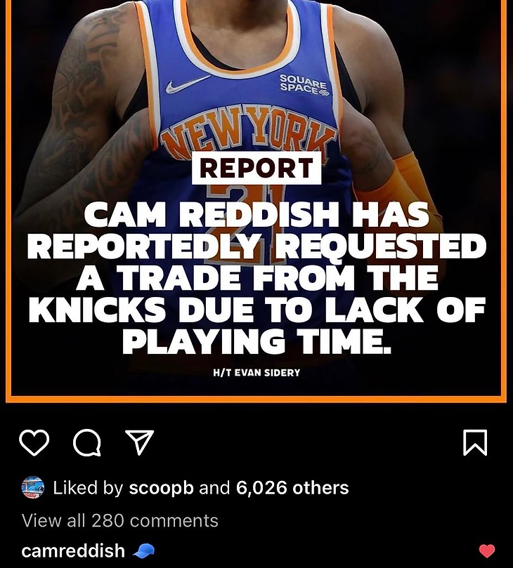 Форвард «Нью-Йорка» Кэм Реддиш опроверг сообщение New York Post о том, что он запросил обмен в другую команду из-за недостаточного количества игрового времени.