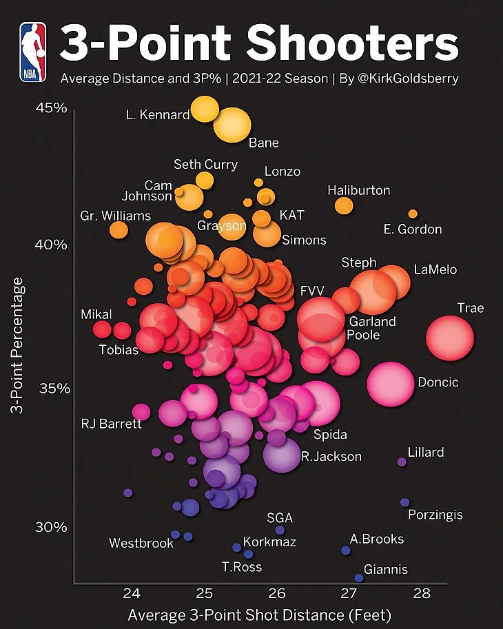 Эксперт Кирк Голдсберри представил инфографику, на которой средняя дальность 3-очковых бросков игроков НБА соотносится с процентом реализации.