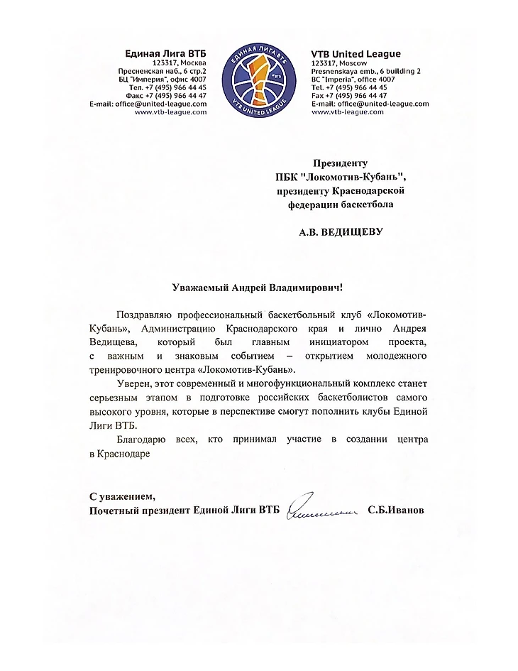Была зачитана поздравительная телеграмма почетного президента Единой лиги ВТБ Сергея Иванова. С видеоэкранов всех присутствовавших приветствовали президент РФБ Андрей Кириленко и генеральный директор Единой лиги ВТБ Илона Корстин.