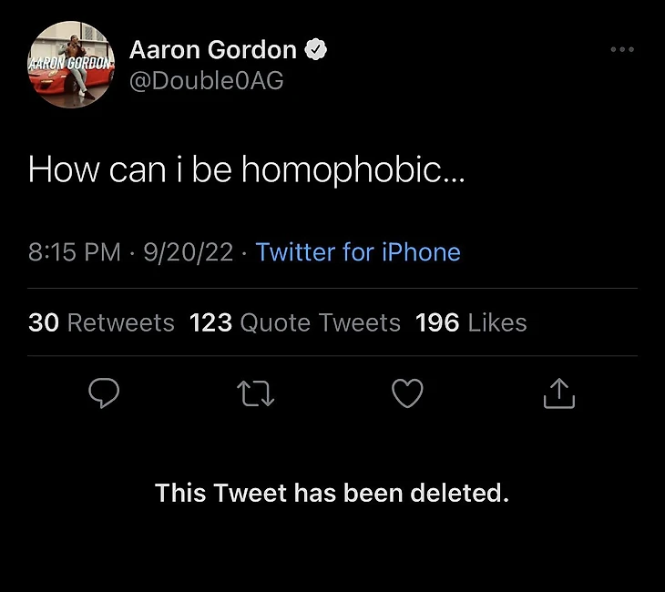 Гордон опубликовал три эмодзи с большим пальцем вниз, чем вызвал бурную реакцию болельщиков в Twitter. Через несколько минут игрок удалил твит и написал: «Как я могу быть гомофобом...»