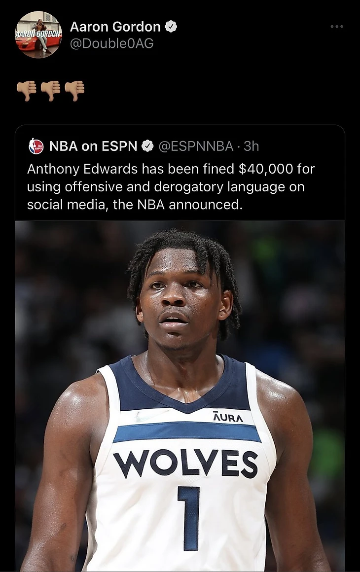 Форвард «Денвера» Аарон Гордон неоднозначно отреагировал на новость о штрафе НБА в отношении Энтони Эдвардса («Миннесота»).
