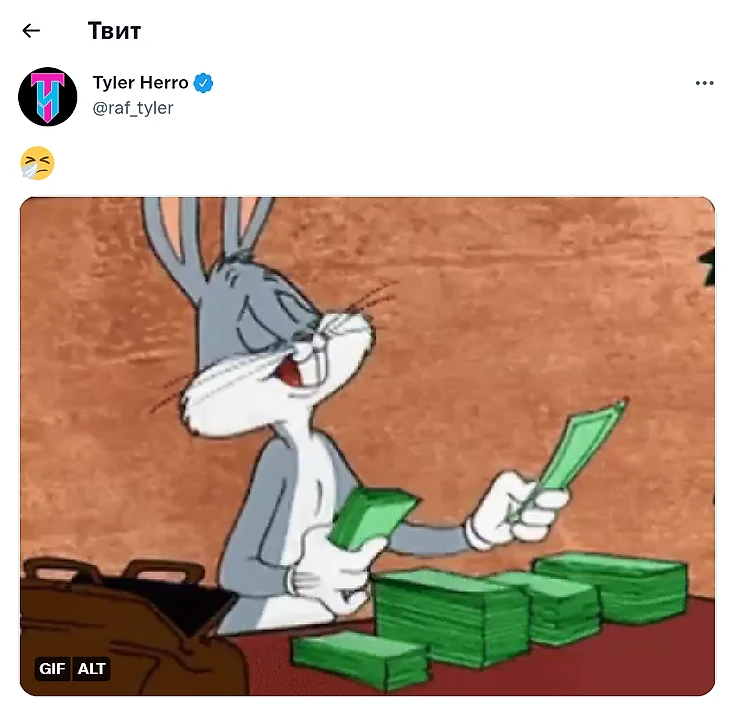Тайлер Хирро выложил мем с Багзом Банни, который считает доллары