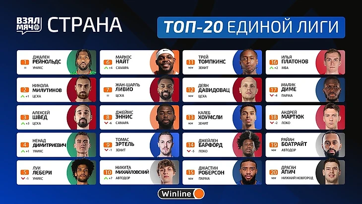 «Взял Мяч» обновил Топ-20 игроков Единой лиги ВТБ. Рейнольдс сместил Милутинова с первого места