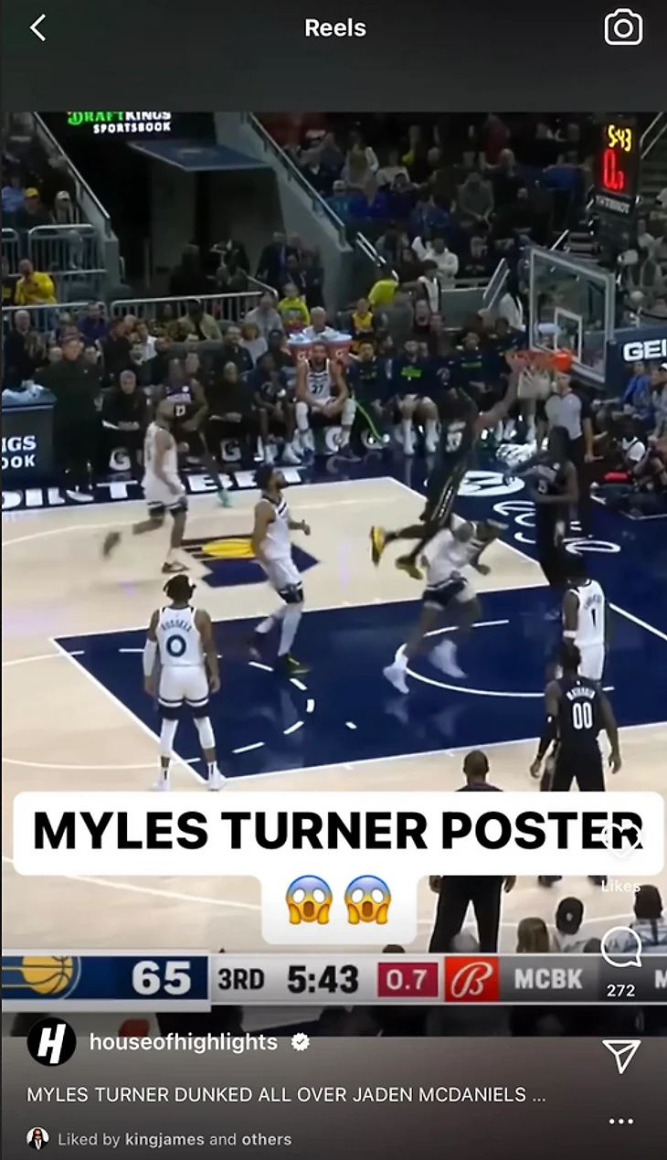 Суперзвезда «Лейкерс» Леброн Джеймс лайкнул видео с данком центрового «Индианы» Майлза Тернера через форварда «Миннесоты» Джейдена Макдэниэлса.
