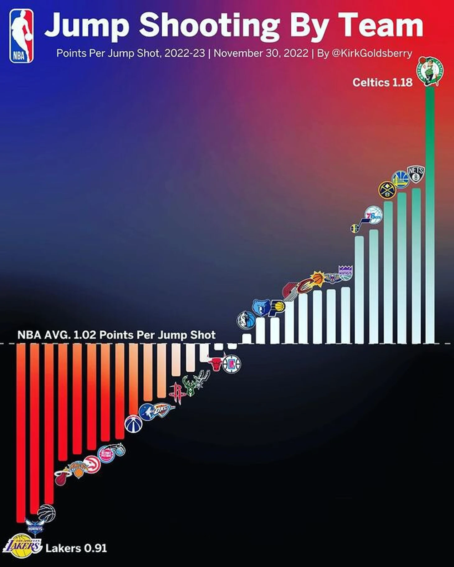 Наименьшая эффективность джамперов в нынешнем сезоне у «Лейкерс» (0,91 очка на один бросок в прыжке).