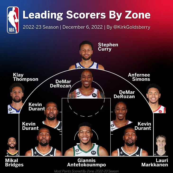 Яннис лидирует в НБА по очкам из «краски», Дюрэнт и Дерозан – со средней дистанции