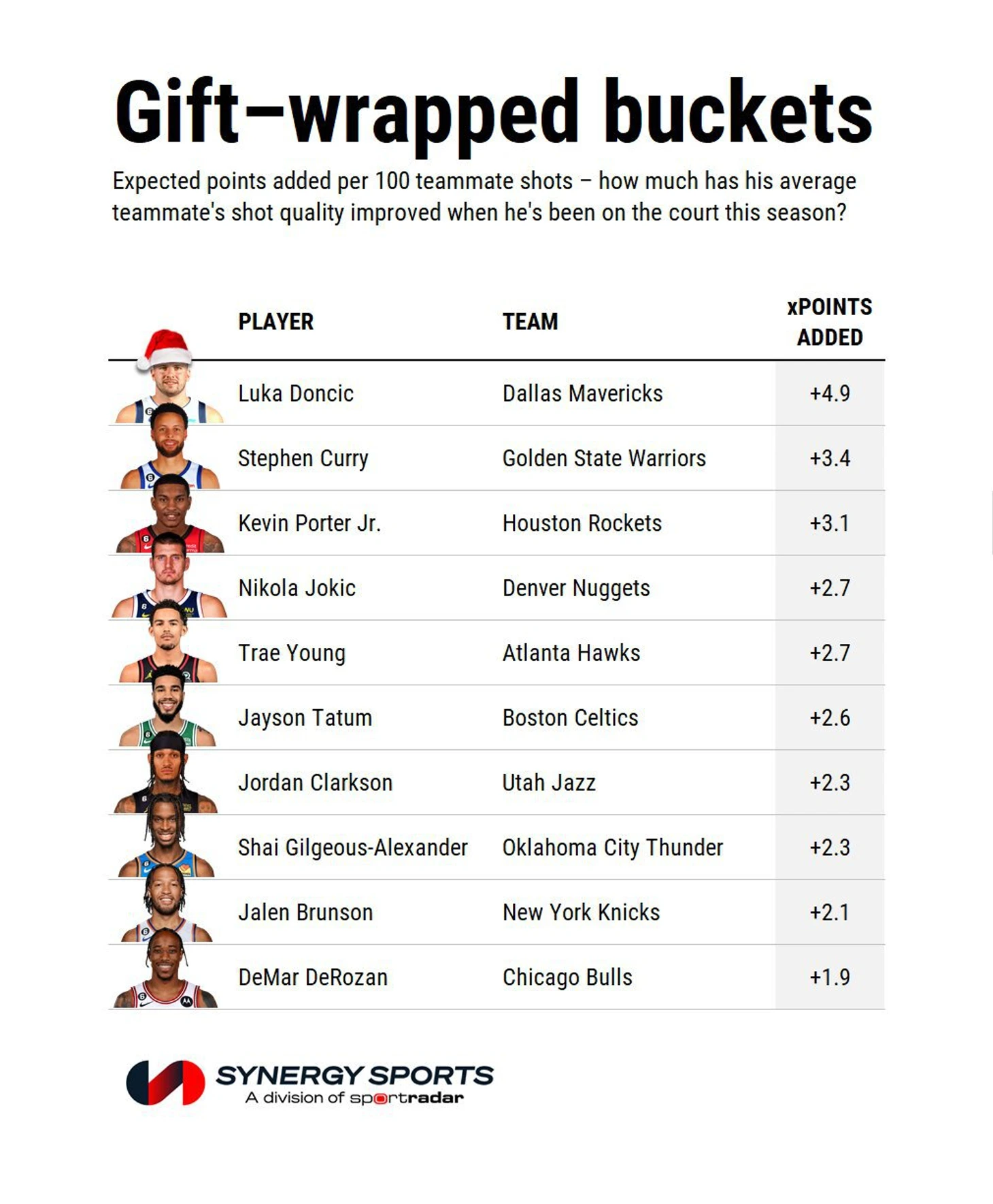 Разыгрывающий «Далласа» Лука Дончич увеличивает результативность одноклубников на 4,9 очка за 100 владений, когда находится на площадке.
