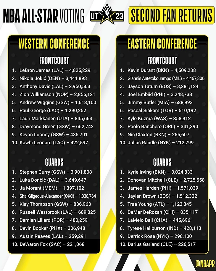 Лидерами голосования остаются форвард «Лейкерс» Леброн Джеймс (4 825 229 голосов) и форвард «Бруклина» Кевин Дюрэнт (4 509 238). Яннис Адетокумбо («Милуоки») немного отстает от Дюрэнта с 4 467 306 голосами.