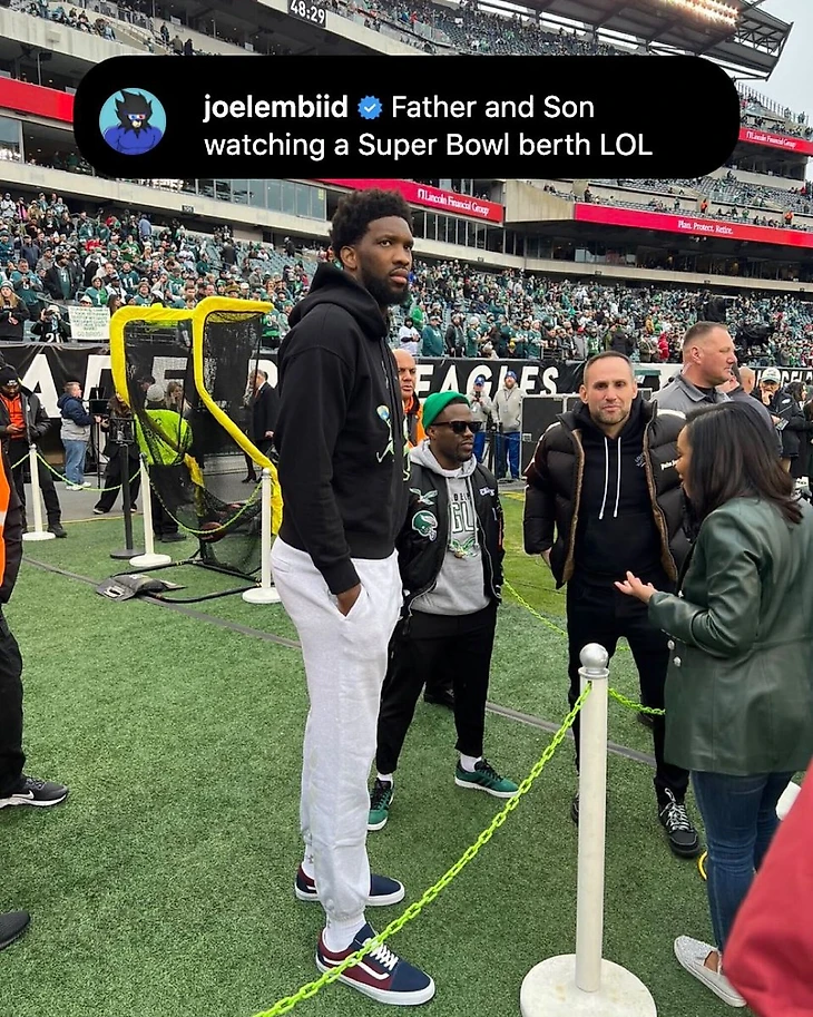 Центровой «Сиксерс» Джоэл Эмбиид и комик Кевин Харт посетили матч команды НФЛ «Иглс».