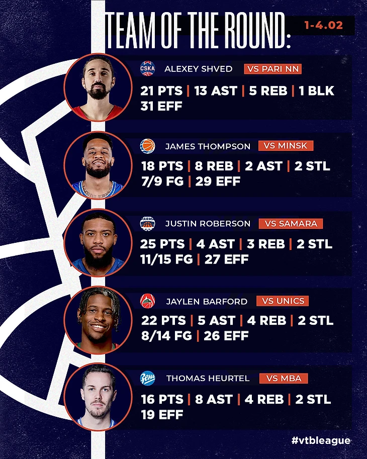 В нее вошли Алексей Швед (ЦСКА), Джеймс Томпсон («Енисей»), Джастин Роберсон («Парма»), Джейлен Барфорд («Локомотив-Кубань») и Томас Эртель («Зенит»).