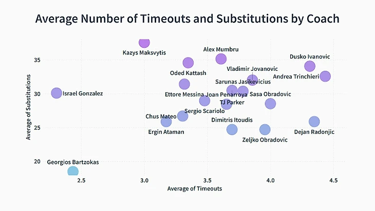Баскетбольный аналитик Дариус Гаруолис представил график со средним количеством тайм-аутов и замен, которое используют за матч главные тренеры Евролиги в этом сезоне.