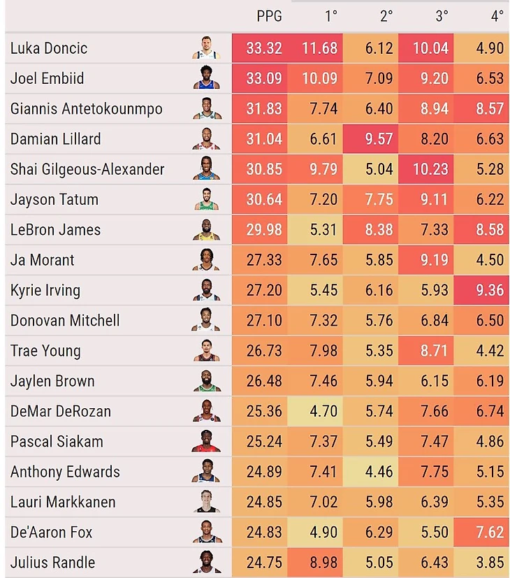 Представлен график с распределением результативности лидеров текущего сезона НБА по набранным очкам по отдельным четвертям.