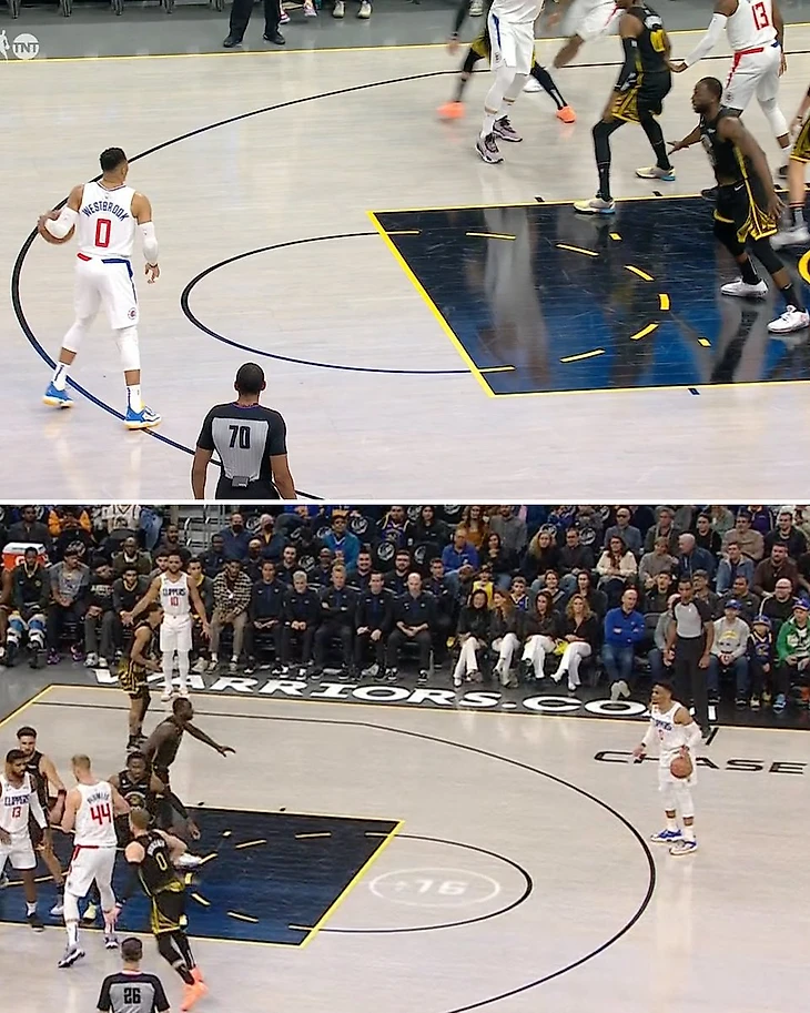 Форвард «Голден Стэйт» Дрэймонд Грин демонстративно игнорировал потенциальную угрозу от разыгрывающего «Клипперс» Расселла Уэстбрука, когда тот оказывался на дуге.