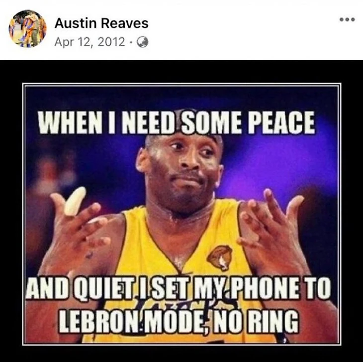 В апреле 2012 года 13-летний Ривз выложил мем с тогдашним оппонентом Джеймса Кобе Брайантом. Подпись гласит: «Когда я нуждаюсь в покое и умиротворении, выставляю телефон в режим Леброна, никаких рингтонов».