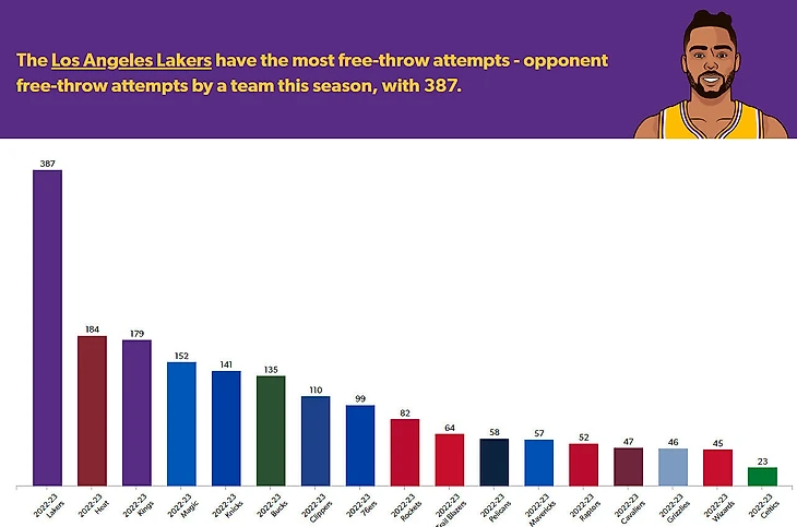 По данным StatMuse, «Лейкерс» в нынешнем сезоне с огромным отрывом лидируют по разнице между количеством исполненных штрафных и количеством штрафных, которые исполнили их соперники.