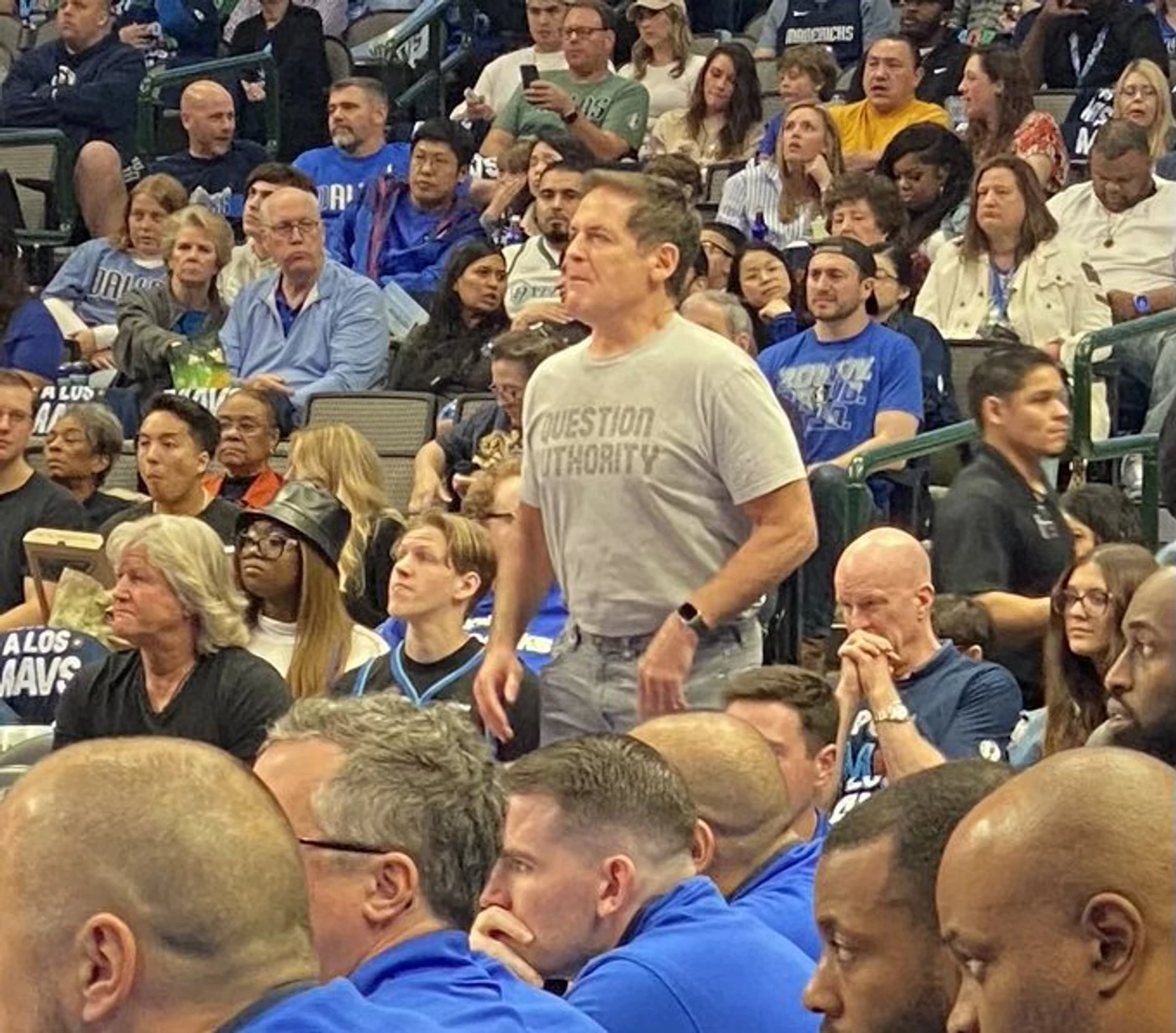 Владелец «Далласа» Марк Кьюбан пришел на игру команды в футболке с надписью, которая отсылает к судейской ошибке в недавнем матче с «Уорриорз».