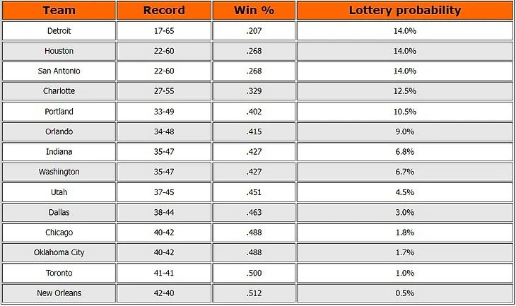 Ниже приведена вероятность получения общего первого выбора на драфте (Lottery probability в таблице) для команд в лотерее. Всего будет разыграно 4 первых номера.