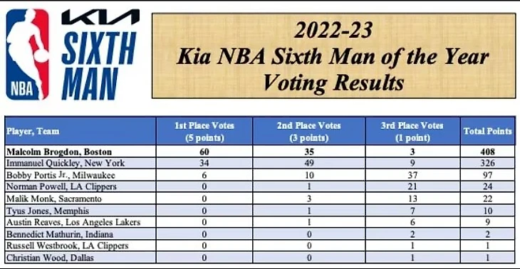 В голосовании он получил 60 первых мест из 100 и опередил защитника «Никс» Иммануэла Куикли и форварда «Милуоки» Бобби Портиса.