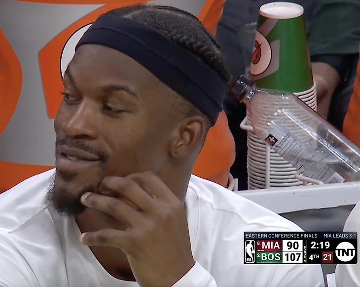Лидер «Хит» Джимми Батлер не выглядел огорченным и улыбался на скамейке под занавес проигранной встречи.