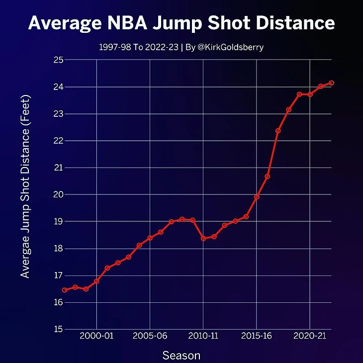 Журналист Кирк Голдсберри представил график, демонстрирующий постоянный рост средней дистанции для бросков в НБА, начиная с 2000 года.