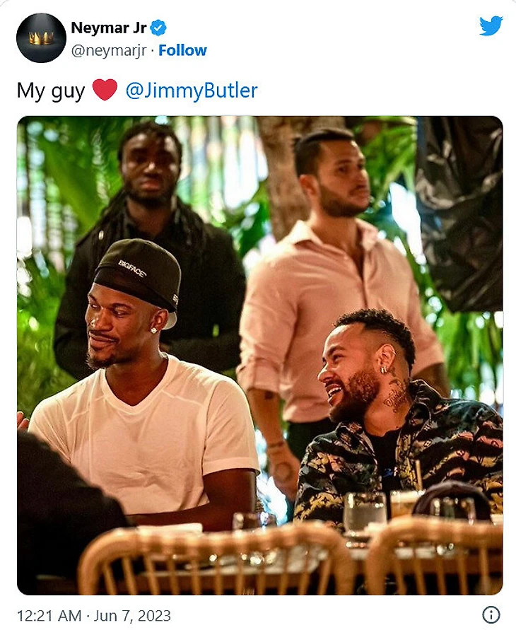 Знаменитый бразильский нападающий «ПСЖ» Неймар по приглашению форварда «Хит» Джимми Батлера прилетел в Майами на 3-й матч финальной серии плей-офф НБА.