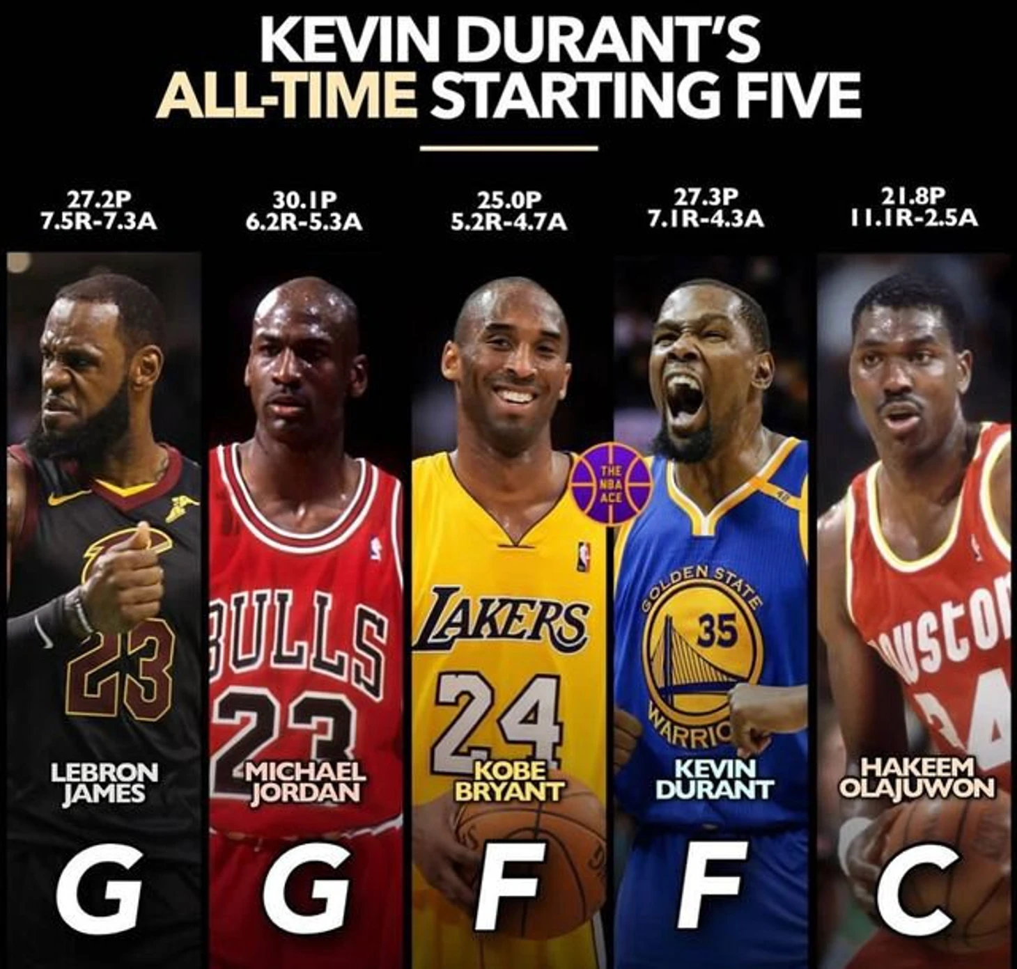 Звездный форвард «Финикса» Кевин Дюрэнт недавно назвал свою стартовую пятерку всех времен, включив в нее себя, Леброна Джеймса, Майкла Джордана, Кобе Брайанта и Хакима Оладжувона.