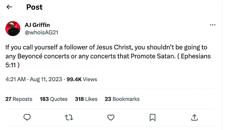 «Если вы называете себя последователем Иисуса Христа, вы не должны ходить ни на концерты Бейонсе, ни на какие-либо другие концерты, пропагандирующие сатану. (Послание к Ефесянам 5:11)», – написал 19-летний Гриффин на своей странице в соцсети, однако затем удалил пост.