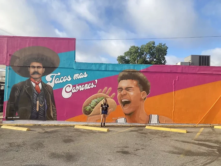 В Сан-Антонио появилось еще одно настенное изображение Вембаньямы. Он держит в руке тако