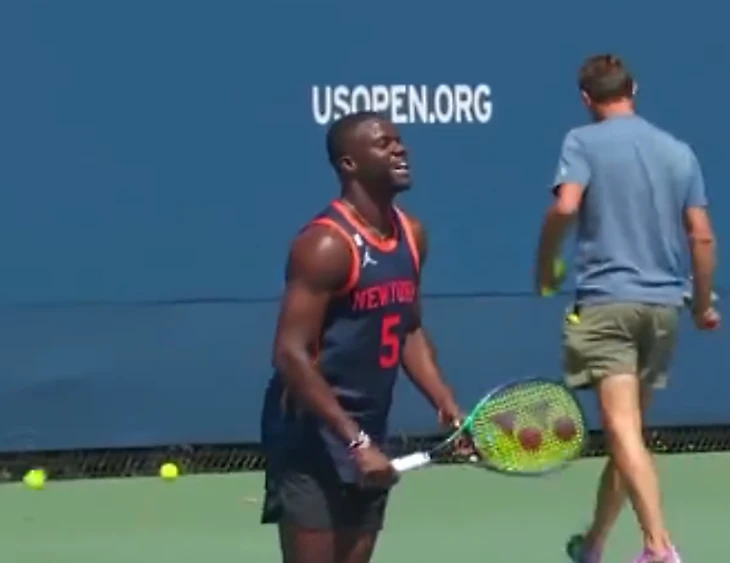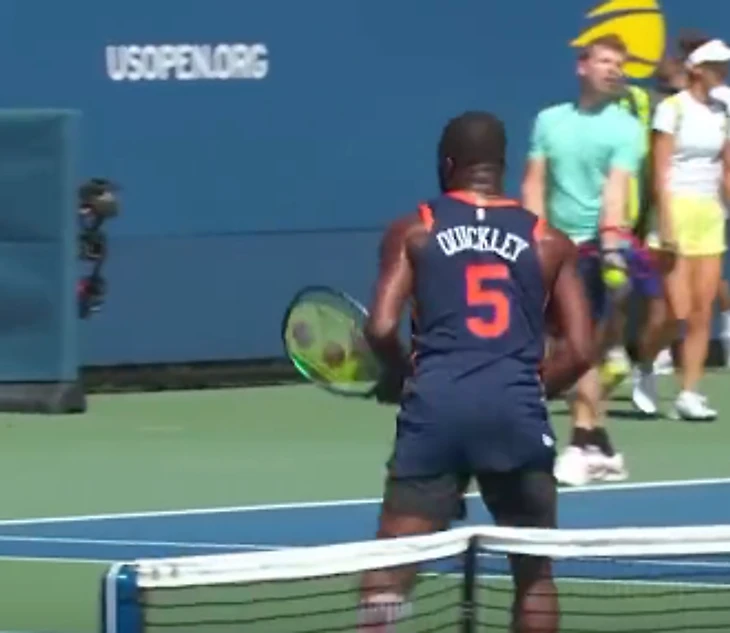 Знаменитый американский теннисист Фрэнсис Тиафу тренируется на US Open в игровой майке защитника «Нью-Йорка» Иммануэла Куикли.