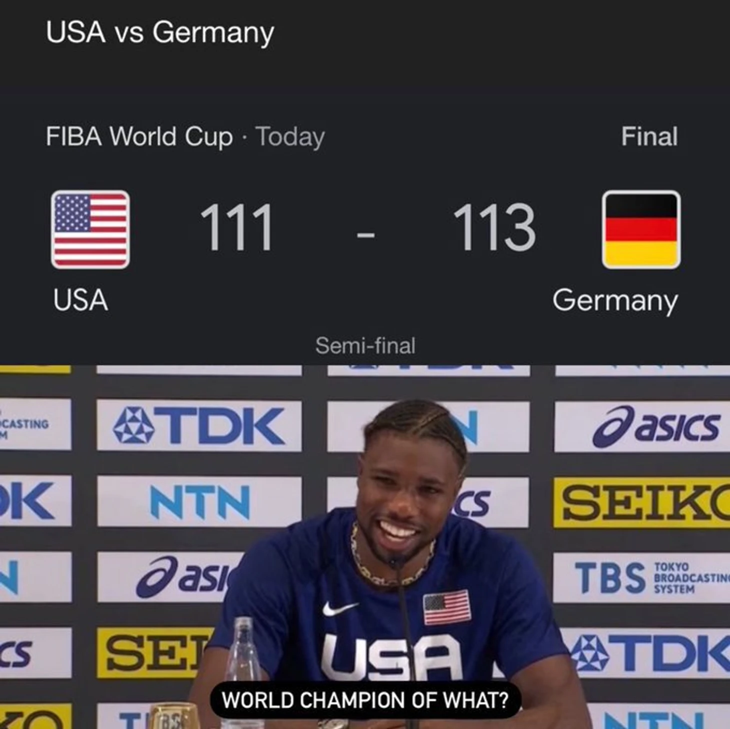 В пятницу составленная из игроков НБА сборная США сенсационно уступила Германии (111:113) в полуфинале ЧМ-2023. Лайлс лайкнул несколько постов по теме, а также сделал репост мема со своим собственным изображением и надписью «Что за чемпионы мира?»