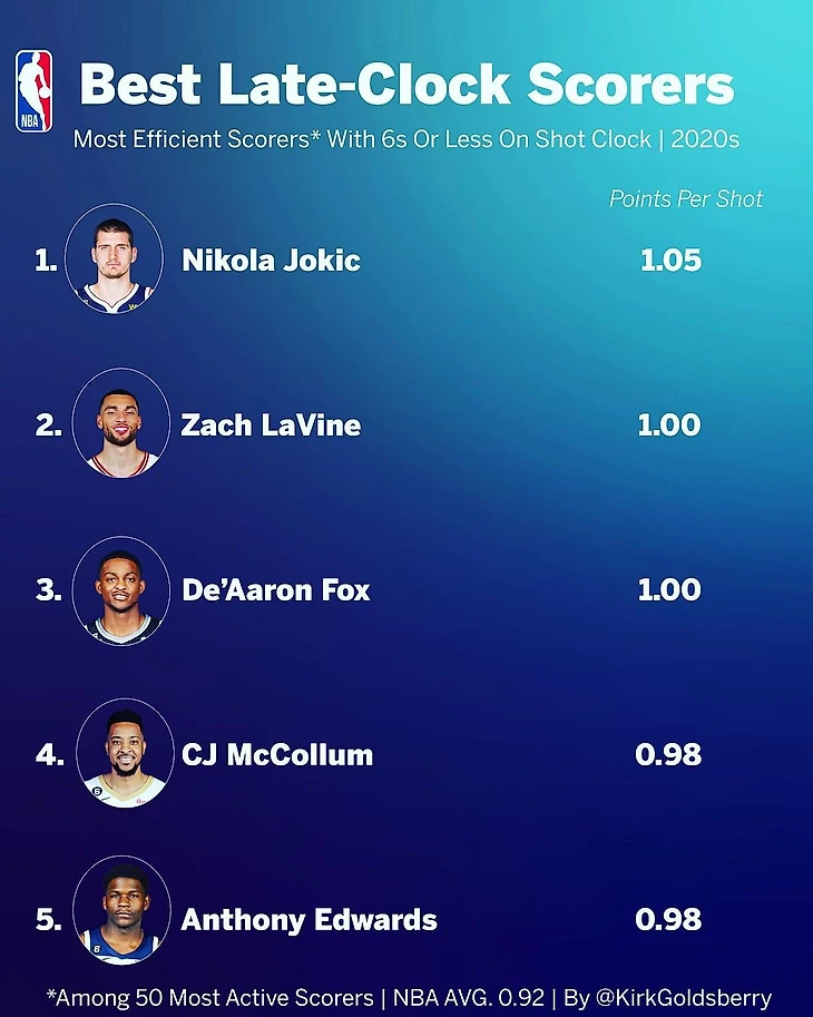 Журналист Кирк Голдсберри представил список из пяти лидеров НБА (с 2020 года) по среднему количеству набранных очков при бросках, которые совершаются за 6 и менее секунд до сирены.