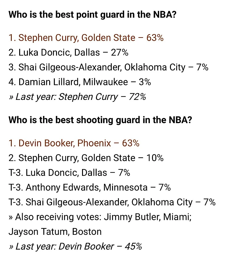 По результатам опроса, лучшим разыгрывающим лиги стал Стефен Карри («Голден Стэйт»), который получил 63 процента голов, лучшим атакующим защитником – Девин Букер из «Финикса» (63%), лучшим легким форвардом – Джейсон Тейтум из «Бостона» (47%), лучшим тяжелым форвардом – Яннис Адетокумбо из «Милуоки» (97%), лучшим центровым – Никола Йокич из «Денвера» (93%).