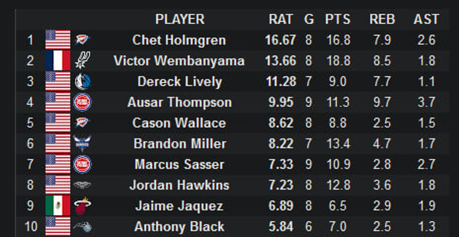 На старте сезона-2023/24 центровой «Оклахомы» Чет Холмгрен (16,67) обходит бигмэна «Сан-Антонио» Виктора Вембаньяму (13,66). Дерек Лайвли (11,28) из «Далласа» идет третьим, а Осар Томпсон («Детройт», 9,95) и Кейсон Уоллес («Оклахома», 8,62) замыкают список лучших новичков на старте сезона.