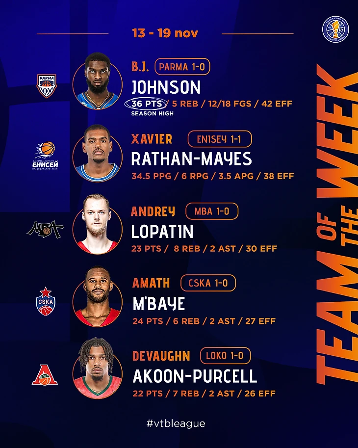 Единая лига ВТБ представила символическую пятерку по итогам игровой недели 13-19 ноября.
