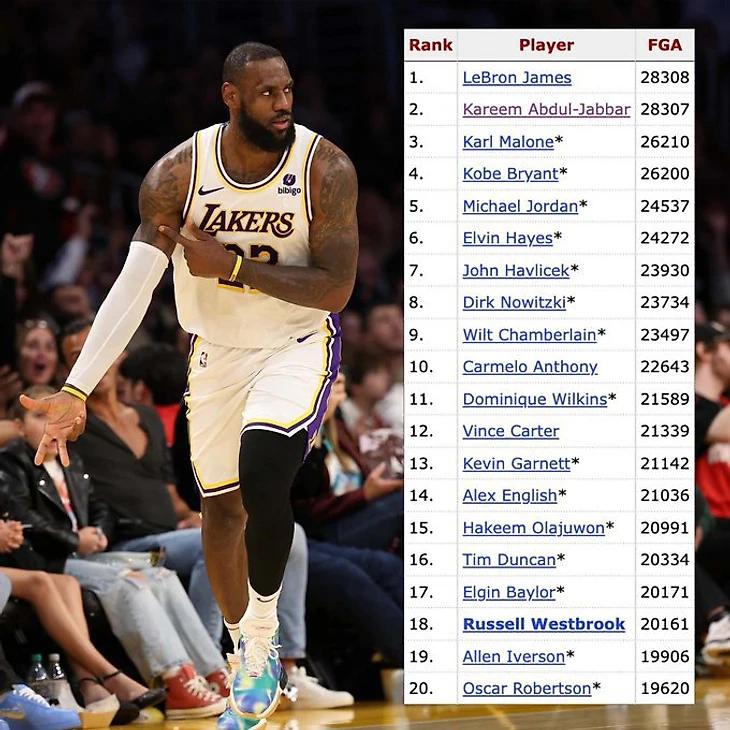 В пятерку лидеров также входят Карл Мэлоун (26 210), Кобе Брайант (26 200) и Майкл Джордан (24 537).