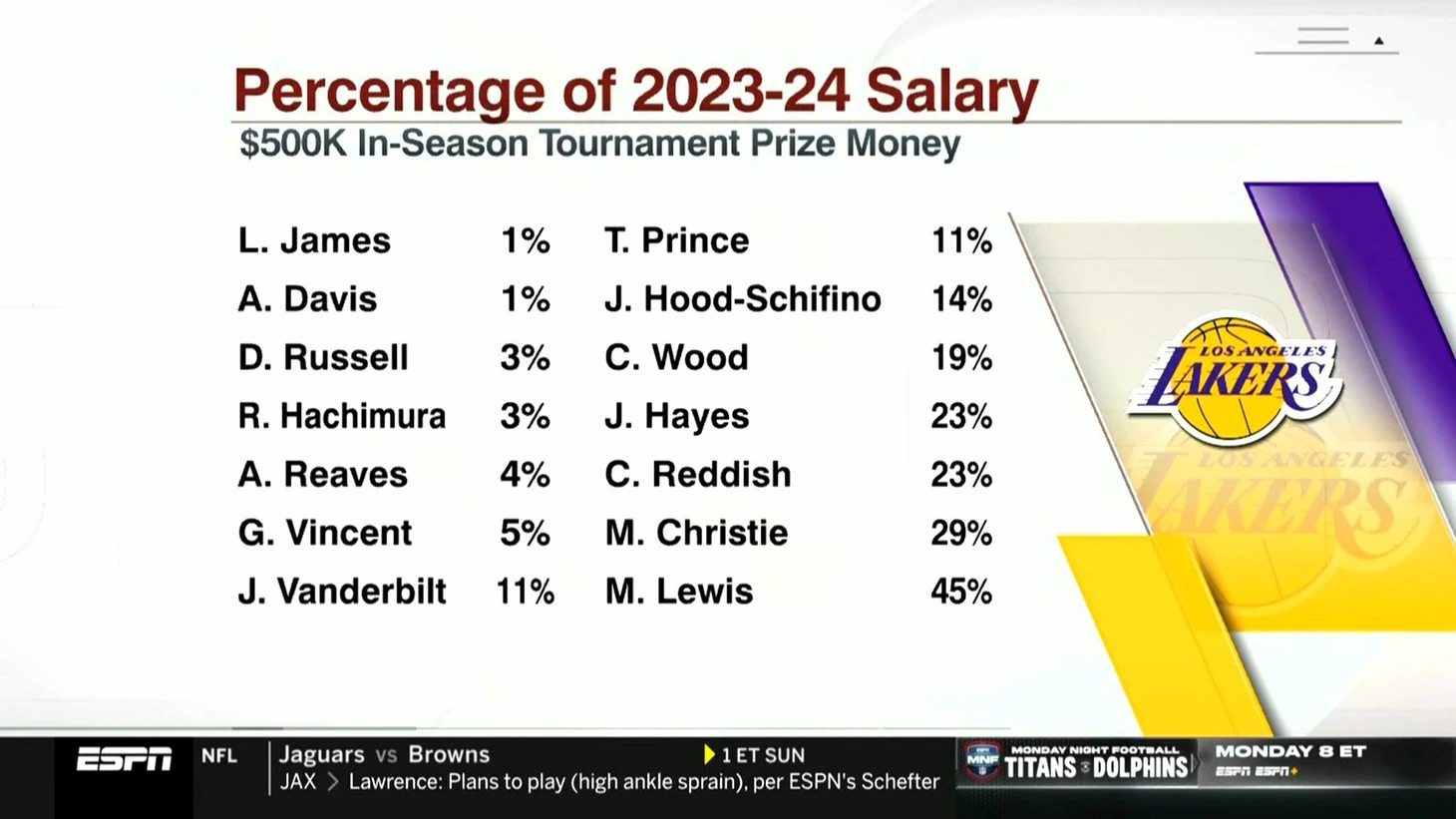 Максвелл Льюис получит 45% прибавку к зарплате после победы во внутрисезонном турнире, Реддиш и Хэйс – 23%, Леброн и Дэвис – 1%