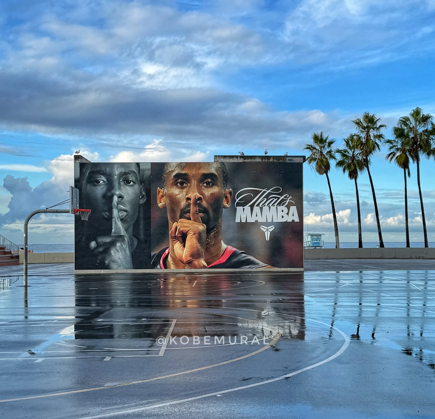 Граффити с легендой «Лейкерс» украсило баскетбольную площадку на пляже.