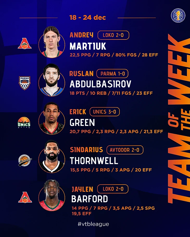 Руслан Абдулбасиров и Андрей Мартюк – в символической пятерке недели Единой лиги ВТБ