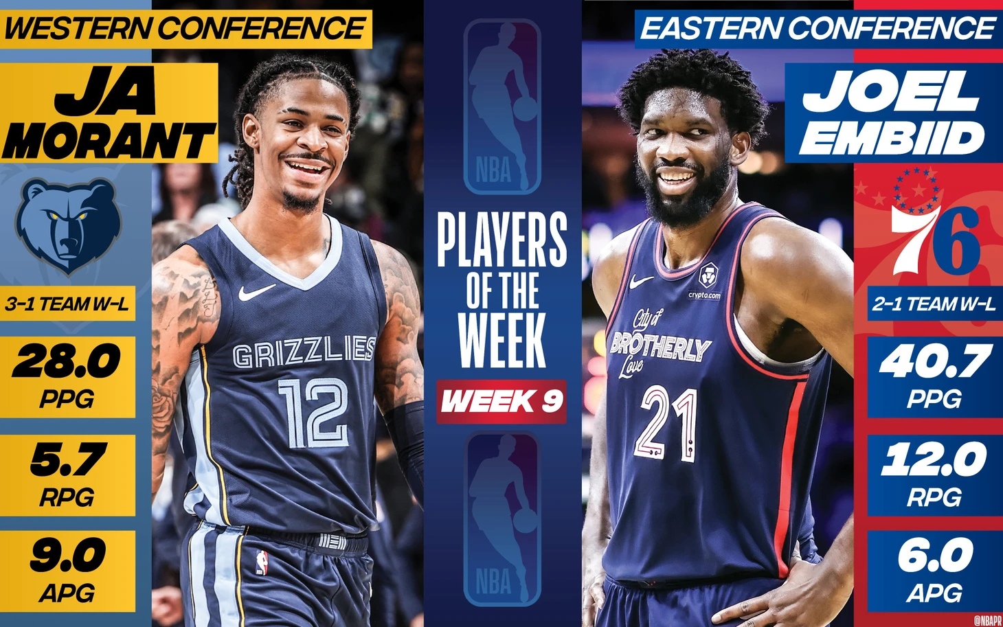 Джа Морэнт и Джоэл Эмбиид признаны лучшими игроками недели в НБА.