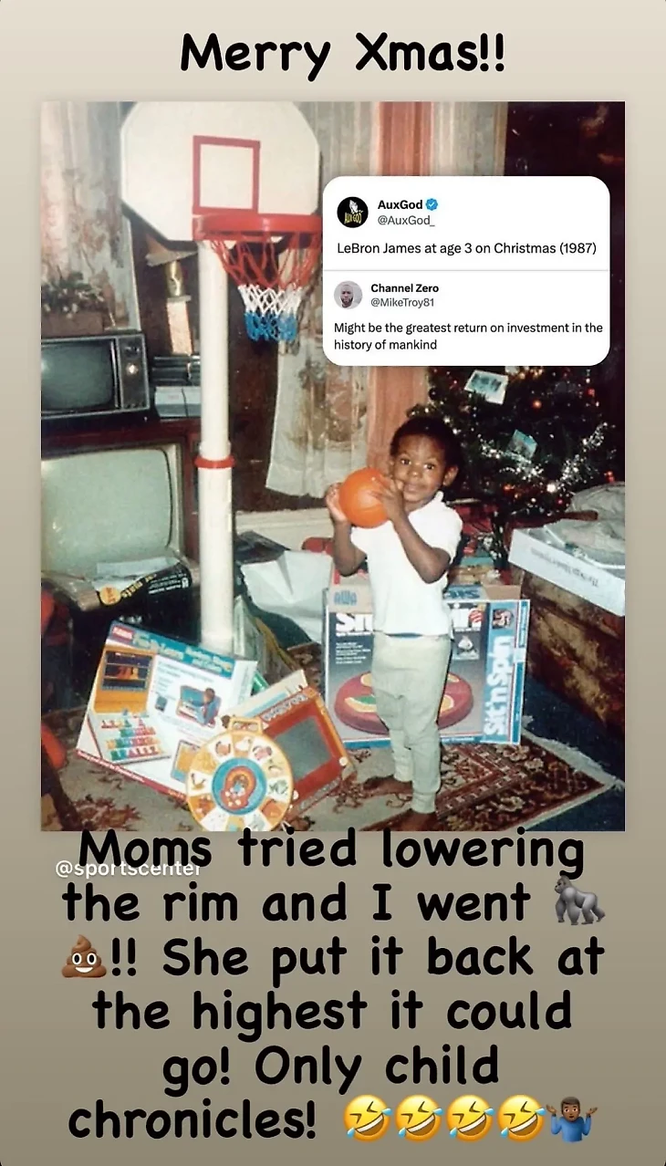 «Мама попыталась его опустить, но я начал вопить!» Леброн Джеймс рассказал, как ему подарили на Рождество детское баскетбольное кольцо