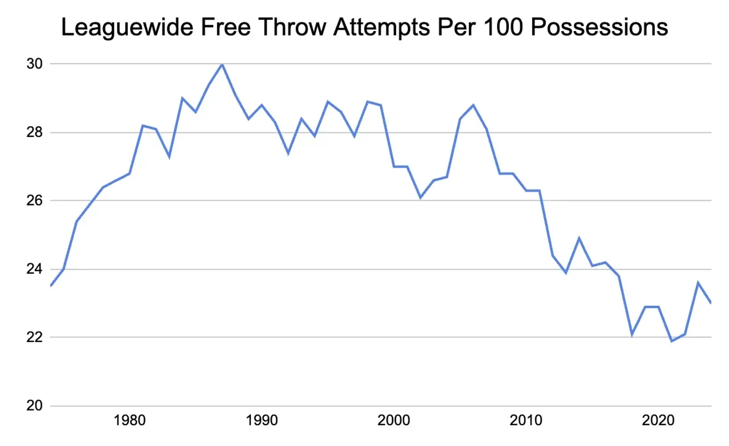 «Во-первых, количество штрафных бросков в лиге уменьшилось, а не увеличилось. На этом графике показано количество штрафных бросков на 100 владений в целом по лиге с сезона-1973/74 (начало сбора данных по владениям на Basketball Reference). Это не похоже на «парад штрафных бросков», – объясняет журналист.
