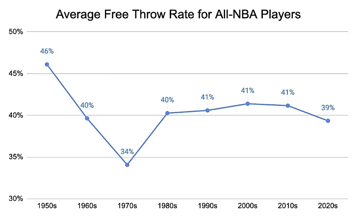 В прошлом сезоне у 15 баскетболистов, вошедших в символические пятерки сезона, средний показатель штрафных бросков составил 42%. То есть от общего числа попыток с игры количество бросков с линии составило 42%. Для сравнения, средний показатель для всех представителей символических пятерок НБА за всю историю лиги – 40%. Современные звезды не встают чаще на линию, чем их предшественники», – заключил Крам.