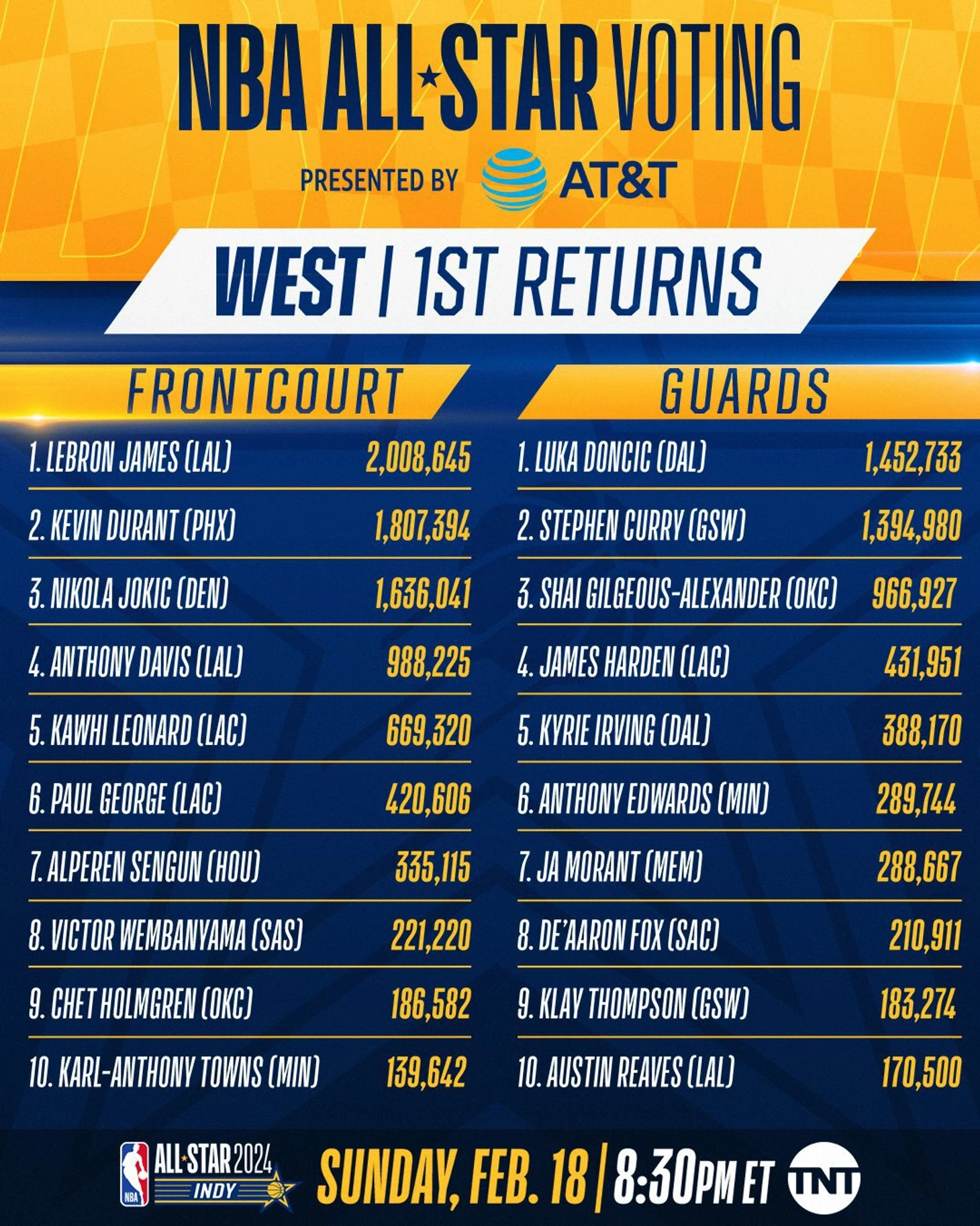 Разыгрывающий «Далласа» Лука Дончич лидирует среди защитников Западной конференции, набрав 1 452 733 голоса. Разыгрывающий «Голден Стэйт» Стефен Карри идет на втором месте с 1 394 980 голосами.